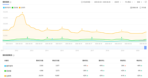 根據百度指數最新數據顯示,近30天數字貨幣搜索指數整體日均值為2555,移動日均值為2077,整體同比上漲44%,移動同比下降49%;近30天區塊鏈搜索指數整體日均值為4566,移動日均值3273,整體同比下跌36%,移動同比下降42%;而近30天比特幣搜索指數整體日均值為20579,移動日均值18987,整體同比下降62%,整體環比下降33%。