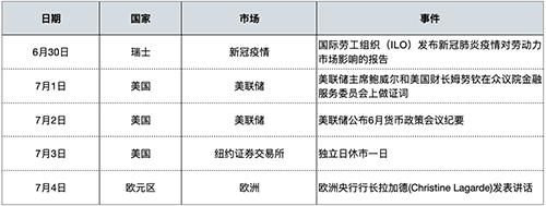 本周正值6月末7月初,美聯儲將于本周四公布6月貨幣政策會議紀要,周五恰逢美國獨立日,紐交所休市一日,周六歐洲央行行長拉加德將發表講話,最近歐美貿易戰升級,歐美的相關政策都會刺激市場敏感的神經,投資者密切關注。